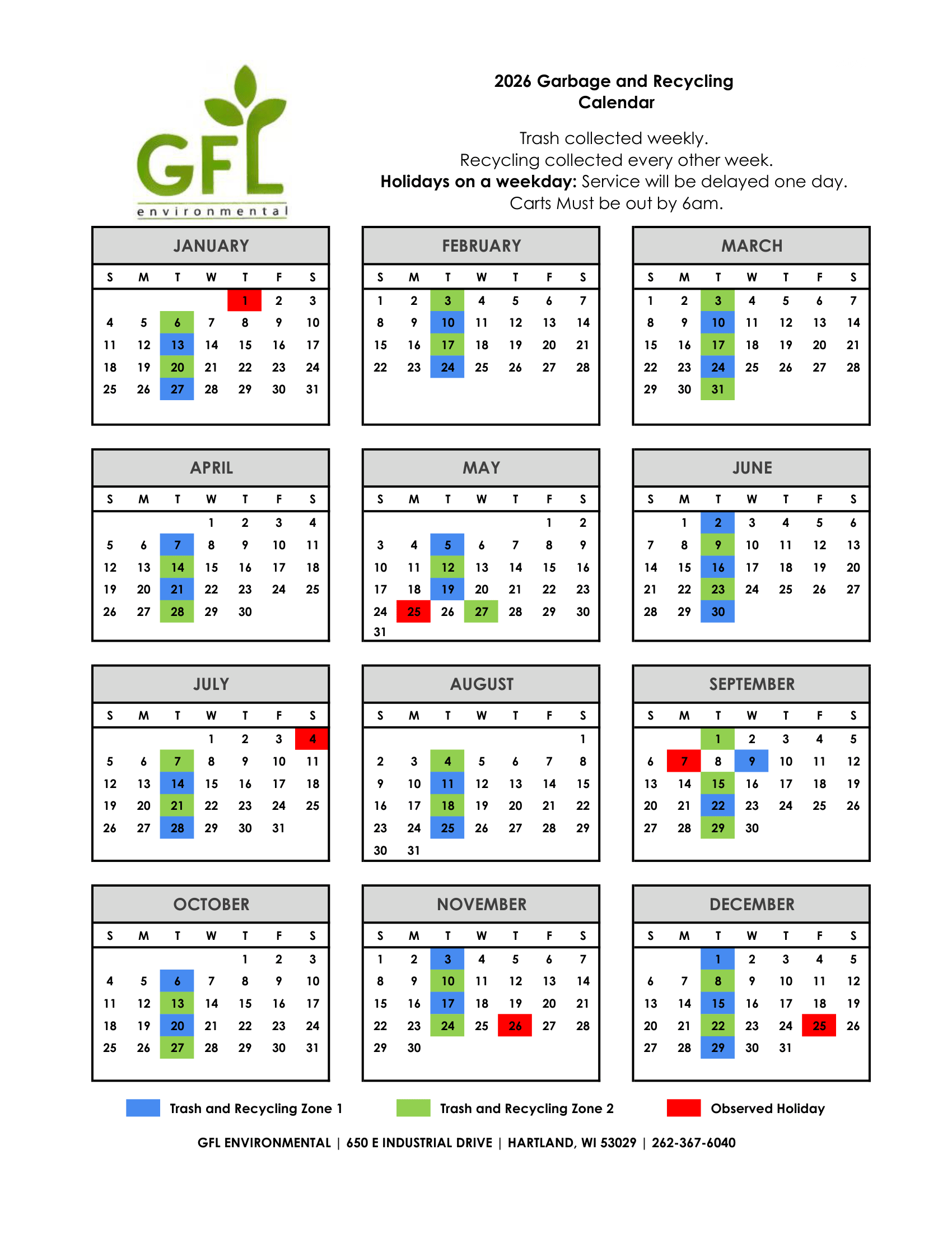 Hartland curbside recycling is provided by GFL Environmental through the Village program. Recycling is collected every other week, based on your zone and the official calendar.