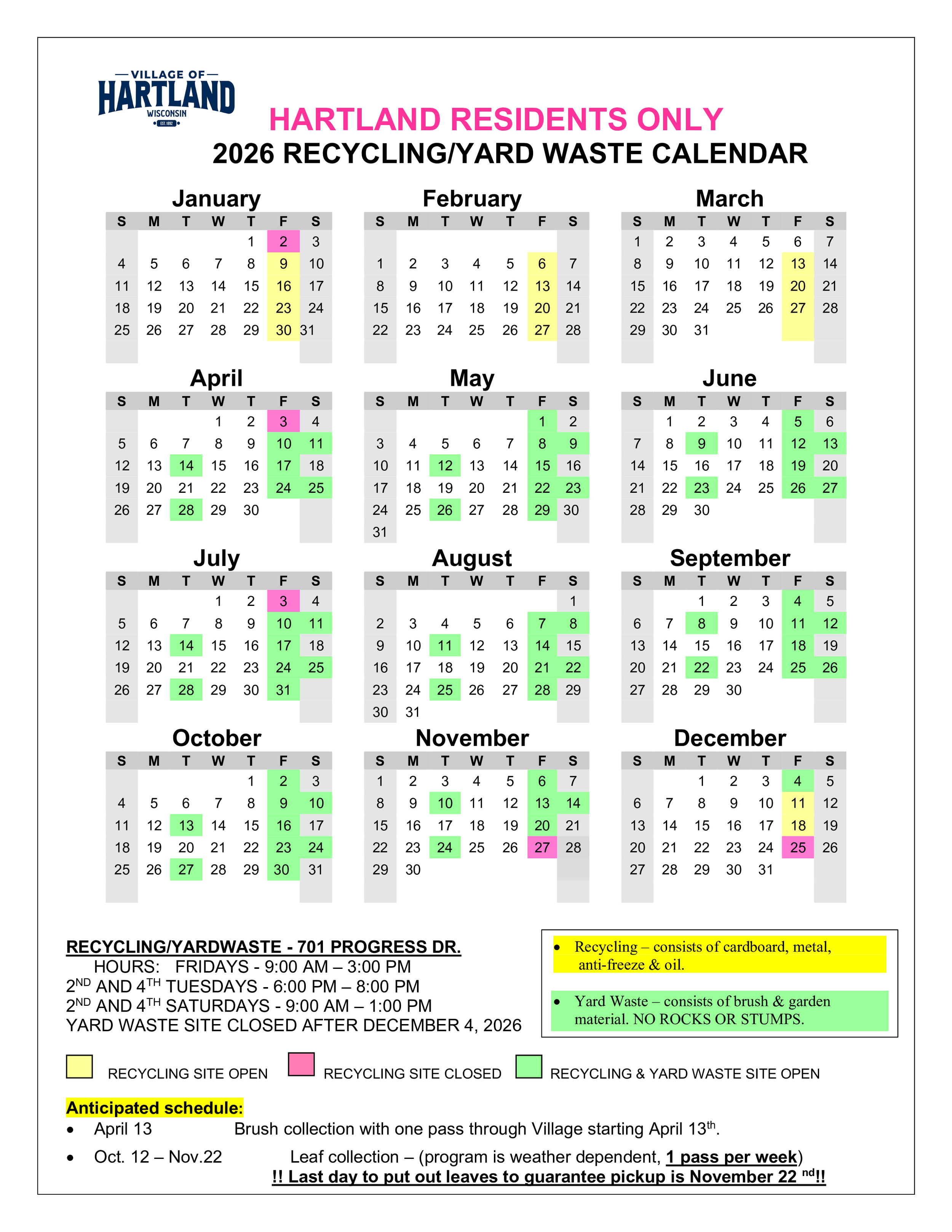 Hartland uses specific seasonal windows for yard programs, including spring brush pickup and fall leaf collection