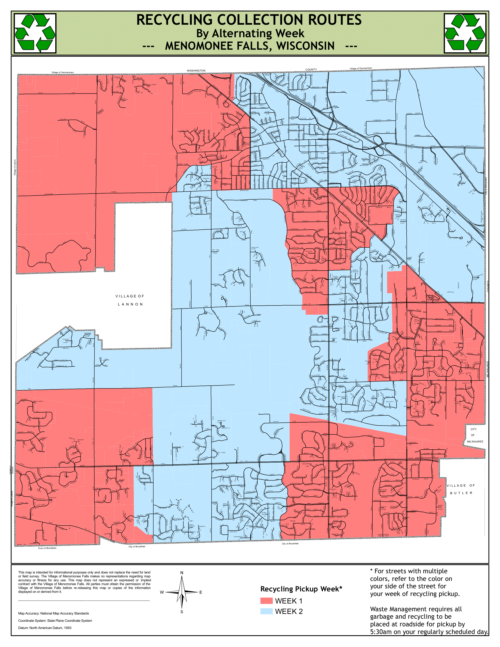 Menomonee Falls residential garbage collection is provided through the Village’s contracted hauler, Waste Management. Use the route map and placement rules below to avoid missed pickups and delays.